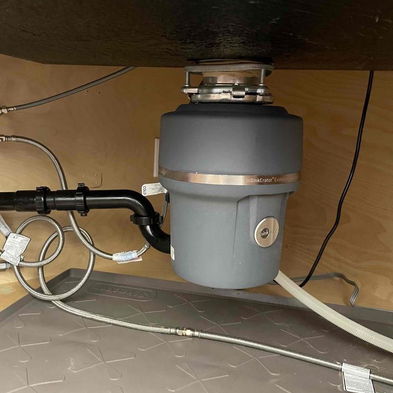 A plumber in Fallbrook, California removed a broken half-horsepower Badger 5 garbage disposal, replaced the sink flange and mounting bracket, and installed a new Badger 5 unit. The plumber connected the dishwasher hose, installed a new arm and gasket, and completed a leak inspection to confirm all connections were secure.