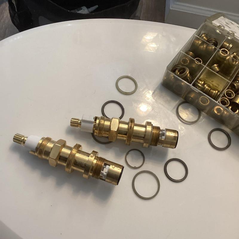 A plumber in Fallbrook, California inspected leaking Price Pfister valve stems and found missing washers. They replaced the washers on both hot and cold stems and reinstalled the valves. The technician also recorded excessive water pressure at 90 psi, which may require a pressure-reducing solution.