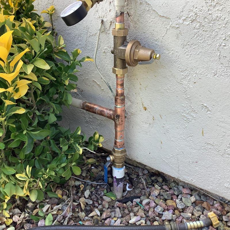 A plumber replaced a failed pressure regulator in Fallbrook, CA. The team removed the old unit, modified solder connections, and installed a new Wilkins 600XLHR PRV. They tested the system for leaks, installed new rubber washers, and set the pressure to 65 psi to ensure proper function.