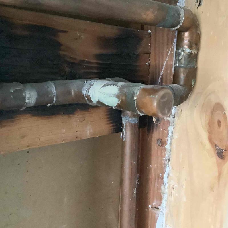 A plumber in Escondido, CA, repaired an active leak by replacing a corroded three-quarter-inch copper pipe with type A PEX. The plumber soldered connections to existing copper, installed a half-inch line to a previous repair, and pressurized the system to confirm no further leaks.