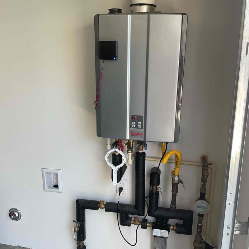A plumber performed a full tankless water heater flush and inspection in Temecula, California. The service included descaling the Rinnai unit, cleaning the inlet screen and air filter, and inspecting for internal issues. The plumber removed sediment buildup and restored normal operation by flushing and restarting the heater.