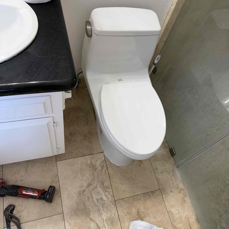 A plumber in Temecula, CA, removed an old toilet in the master bathroom, cleaned the area, and installed a new customer-provided Toto toilet. The installation included a new wax ring, supply line, bolts, and caulking. The system was tested with multiple flushes to ensure proper function.