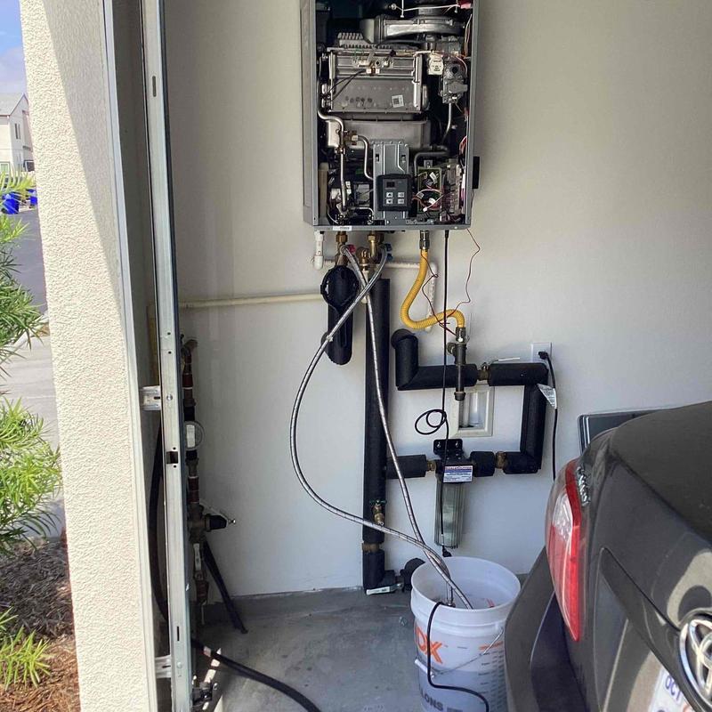 A licensed plumber in Escondido, CA, serviced a tankless water heater. The plumber used a descaling solution, performed forward and reverse flushes, cleared the pre-filter, and confirmed proper operation by testing hot water flow. The service ensures efficient heating and removes buildup.