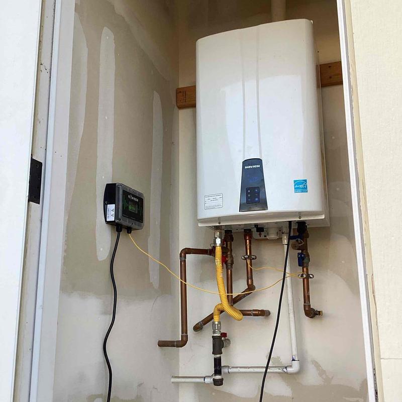 A plumber in Temecula, CA, removed a 75-gallon water heater and installed a Navien NPE 240A2 tankless water heater with a built-in recirculating pump. The job included modifying water and gas lines, installing new PVC drain and exhaust vents, and adding a thermostatic bypass valve under the master bathroom sink.