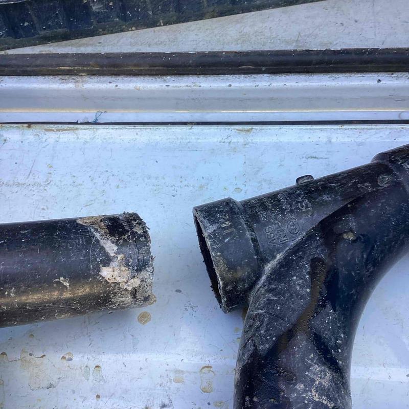 A plumber in Oceanside, California rebuilt a section of ABS pipe connected to a shower drain. The work included cutting out damaged pipe, installing new ABS fittings, and using repair bands to ensure proper slope and leak-free connections.
