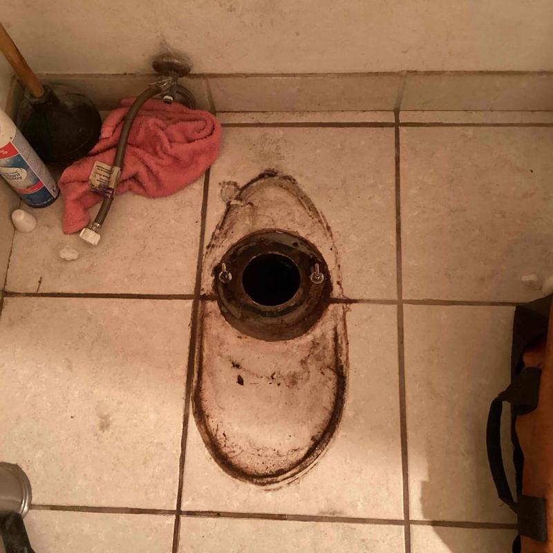 A plumber in Fallbrook, California removed a toilet to inspect the base. They cleaned the area, installed new hardware and an extra-thick wax ring with horn, secured the toilet bolts, applied caulk around the base, and flushed the unit to check for leaks.