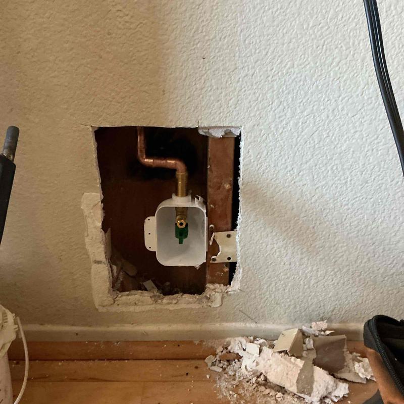 A plumber in Escondido, California, replaced a faulty ice maker box. The plumber removed drywall, disconnected the old unit, and installed a new ice maker valve and box using soldered copper fittings. After restoring water flow, the plumber inspected all connection points and confirmed there were no leaks.