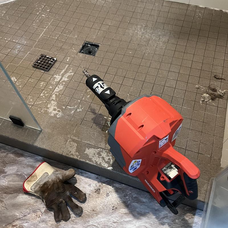 A plumber in Fallbrook, California cleared a blocked shower drain in a master bathroom. The technician used a drain snake to remove hair and debris. The drain was tested to confirm proper water flow after cleaning.