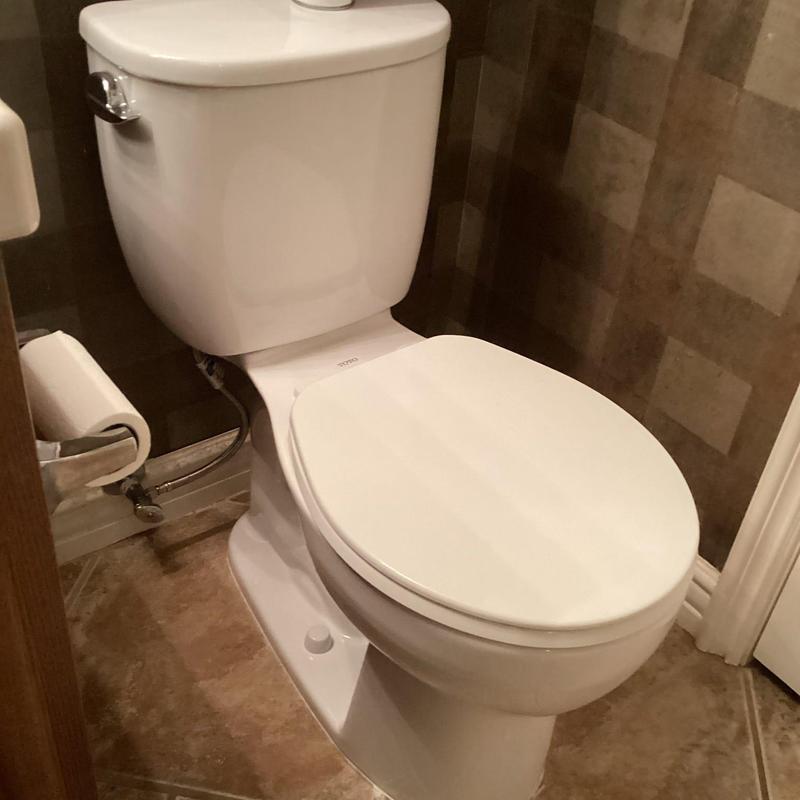 R and R Plumbing installed two Toto two-piece right height toilets in Hemet, California. Work included replacing one round front toilet in a downstairs bathroom and one elongated front toilet in an upstairs master bathroom. Each installation covered the toilet, seat, wax seal, water supply line, and removal of the old units.