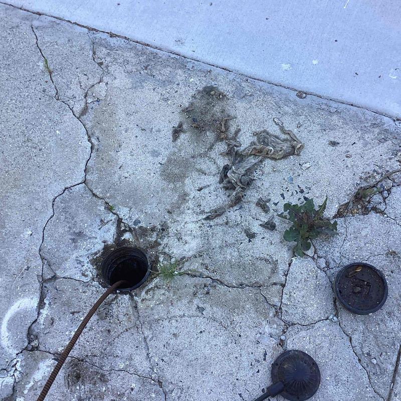 A plumber in Lake Elsinore, California cleared a main sewer line using a rigid flex shaft to remove a clog caused by cast-iron pipe buildup and flushable wipes. A camera inspection showed the pipe is mostly intact. The plumber recommended descaling to improve flow and will provide an estimate for further cleaning.