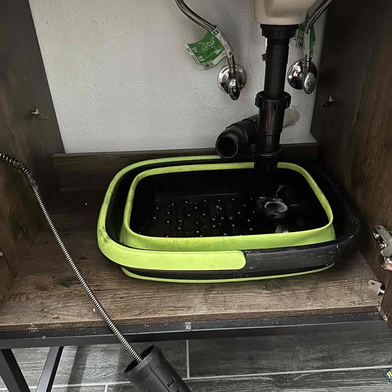 R and R Plumbing repaired a leak under a master bathroom sink in Lake Elsinore, California. The team removed the damaged trap, fabricated and installed a new 1½-inch tubular trap and extension, then tested the system by filling and draining the sink multiple times to confirm proper function.
