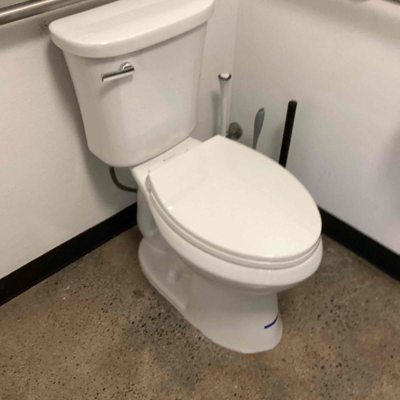 A plumber installed a Glacier Bay elongated vacuum assist toilet in a laundromat restroom in Lake Elsinore, California. The contractor tested multiple flushes to ensure proper function and sealed the base with caulk for added protection.