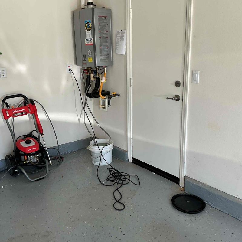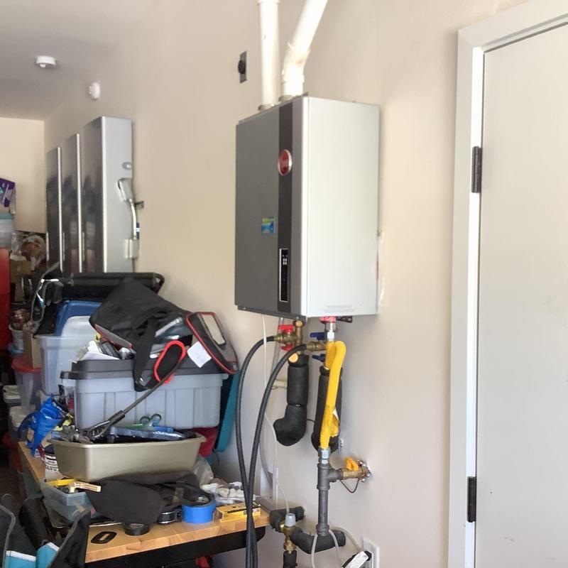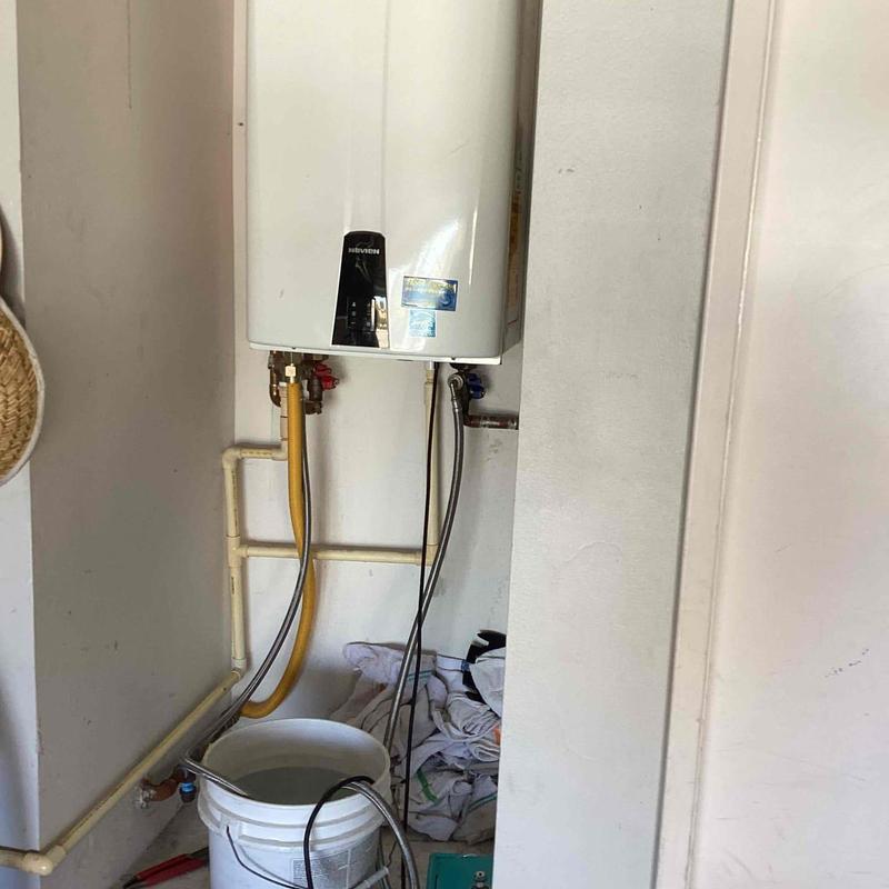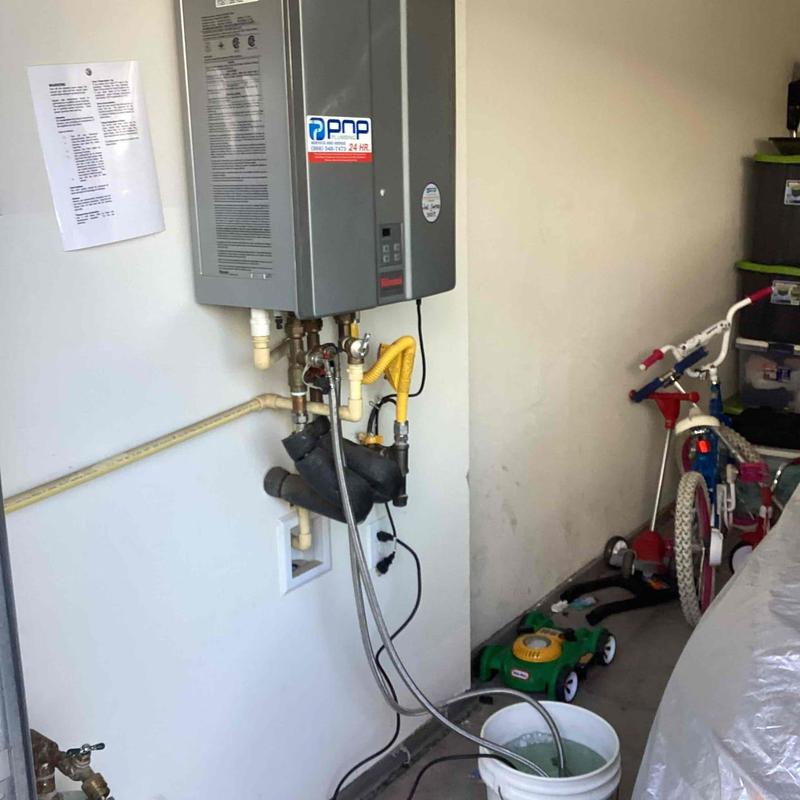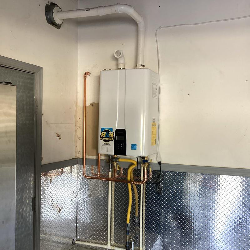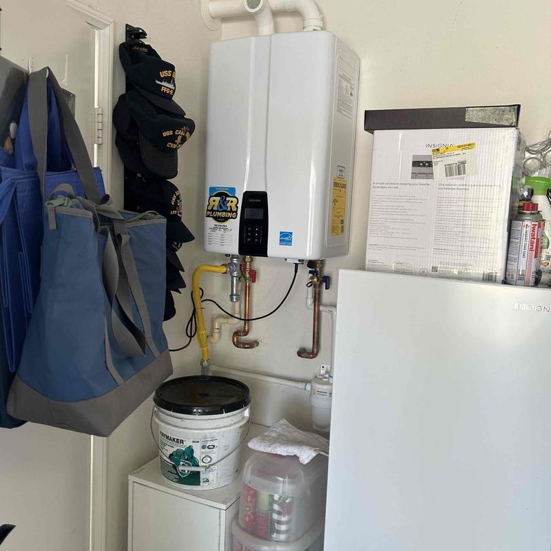 R and R Plumbing removed a 40-gallon natural gas water heater in a garage and installed a new Navien NPE-210S2 tankless water heater in Hemet, California. The team connected the unit using existing water and gas lines and included isolation valves, parts, and labor for a complete installation.