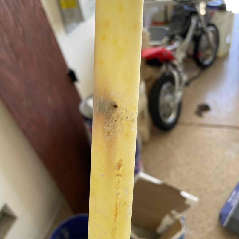 A plumber in Murrieta, California replaced a damaged cast iron pipe exposed behind stucco with a new ABS pipe. The service did not include stucco repair after the pipe replacement.