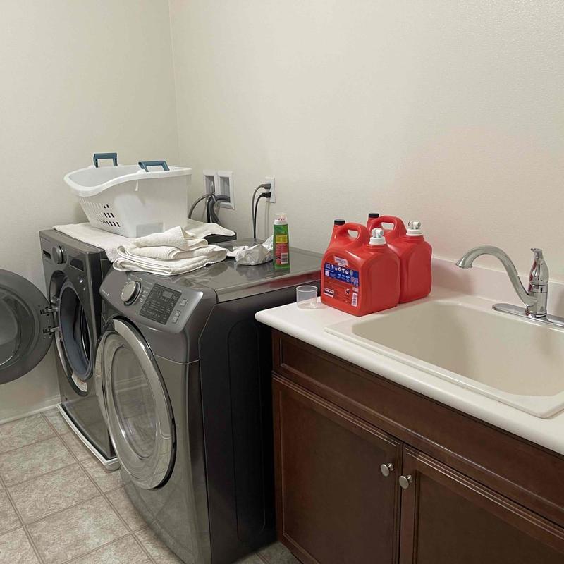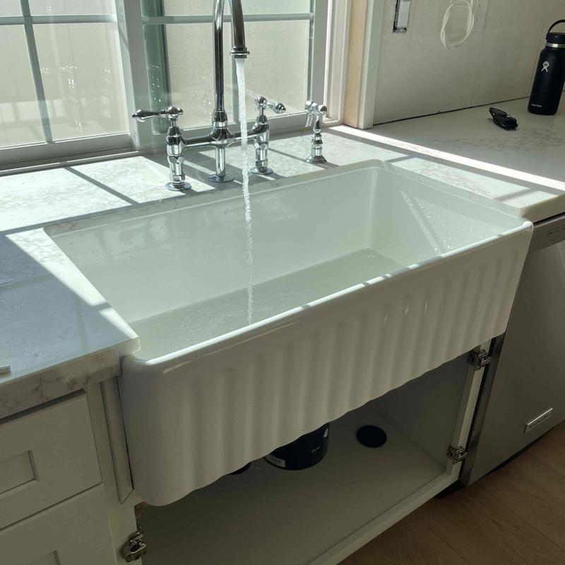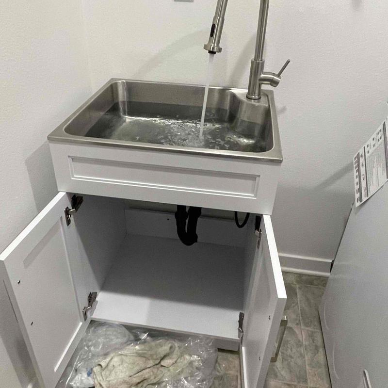 A plumber in Menifee, California installed a customer-supplied utility sink, secured it to the wall, and connected it to existing water lines. They attached a new faucet and basket strainer, then connected the drain with new piping. The plumber tested the system by filling and draining the sink multiple times to ensure there were no leaks.