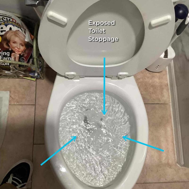 A plumber in Hemet, California investigated a clogged toilet drain in a master bathroom. After snaking the line multiple times without success, they used a camera and found debris resembling grout or concrete. They recommended hydro jetting the drain to clear the blockage and restore proper flow.