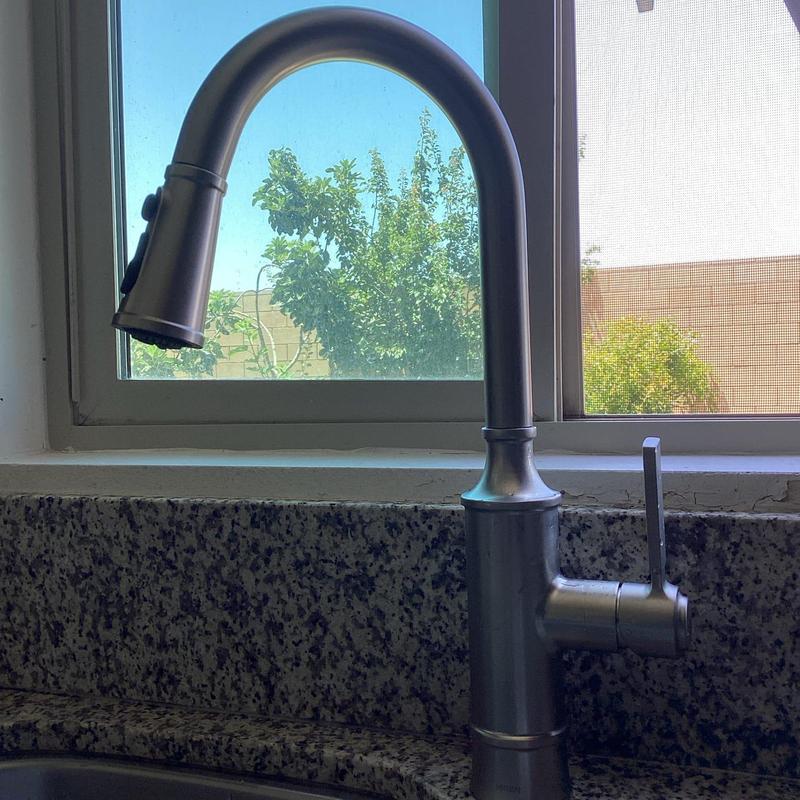R and R Plumbing installed a homeowner-supplied Moen single-handle kitchen faucet with a pull-down sprayer in Hemet, California. The technician confirmed the shower faucet was working properly. The reverse osmosis water tap was missing its spout and handle at the time of the visit.
