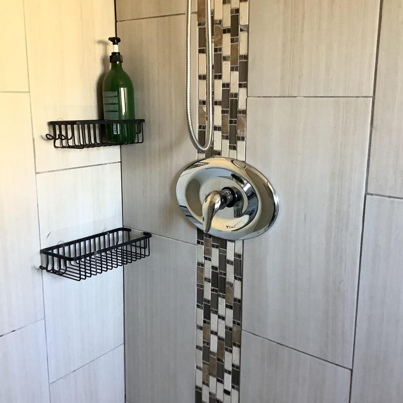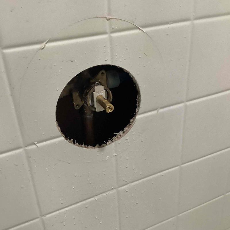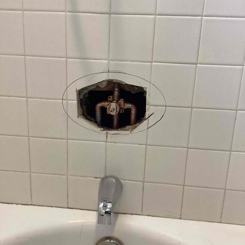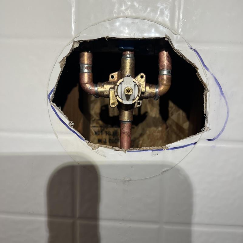 A plumber in Murrieta, California replaced a shower valve by cutting tile to access the area, removing the old valve, and soldering in a new one. They installed a new chrome trim and diverter, sealed all edges with caulk, restored water service, and tested the system for leaks.