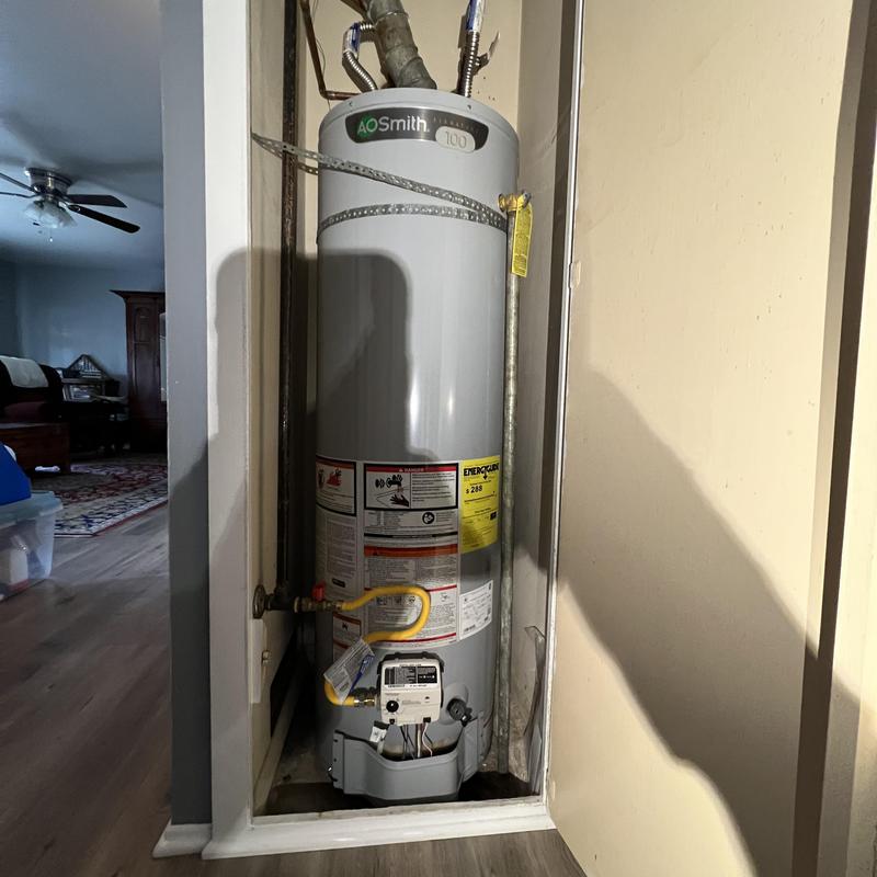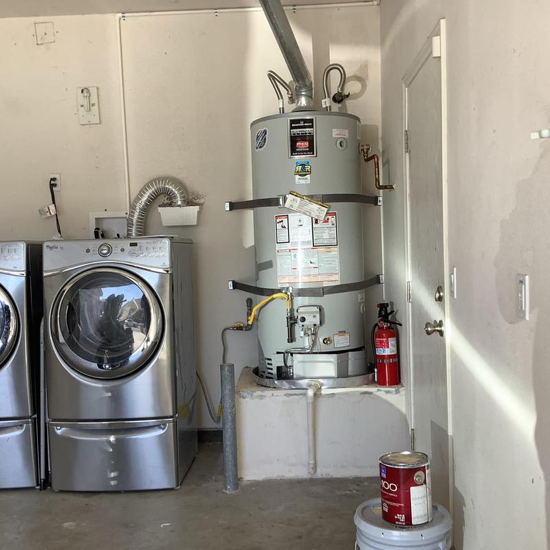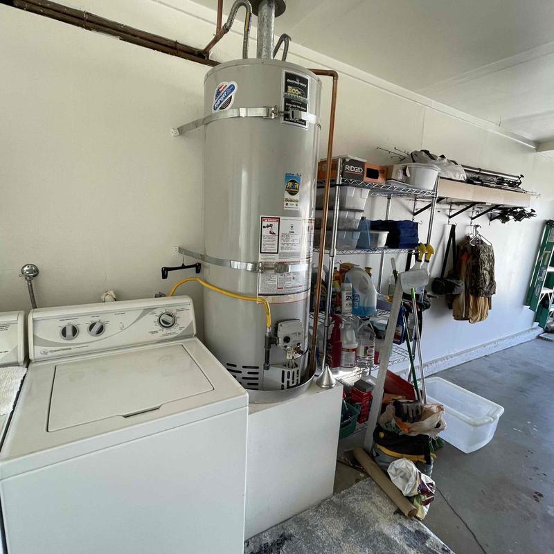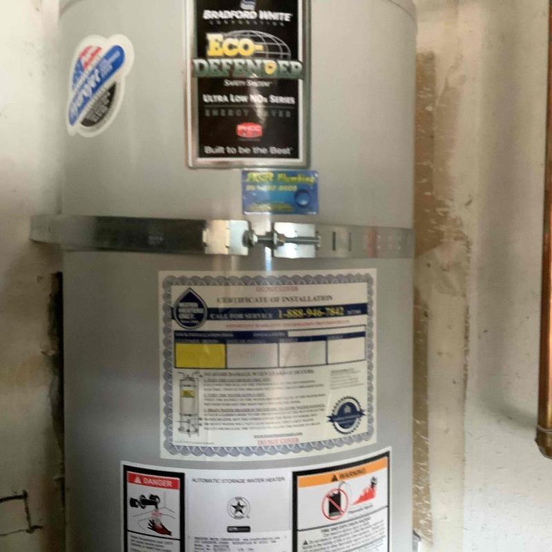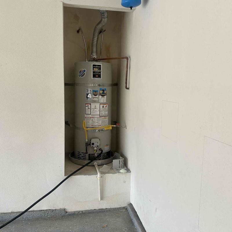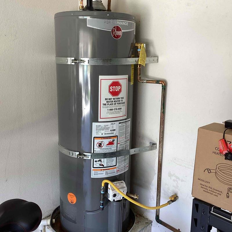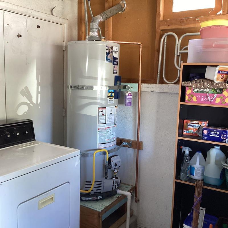A plumber in Hemet, California removed an old water heater, disposed of it, and installed a new 50-gallon Bradford White unit. The project included extending water and gas lines, adding a sediment trap, and installing a catch pan. All connections were inspected and tested for leaks after installation.