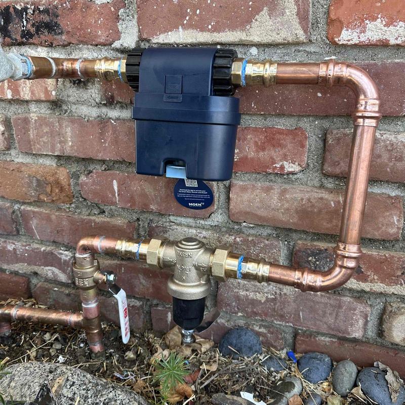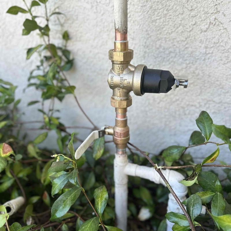 A technician in Murrieta, California installed a Moen Flo leak detection device and a ¾-inch pressure regulator. They reconfigured the service riser, repaired the irrigation feed, and tested the system for leaks to ensure proper operation.