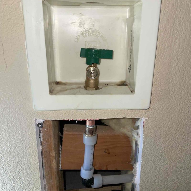 R and R Plumbing repaired a leaking ice maker valve in Murrieta, California. The technician removed damaged drywall, replaced the valve, and connected it with PEX-A fittings and rings. After restoring water service, they verified proper valve operation with no leaks.