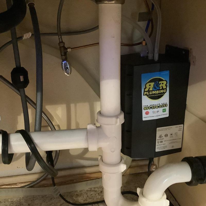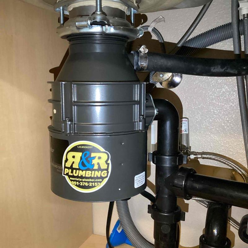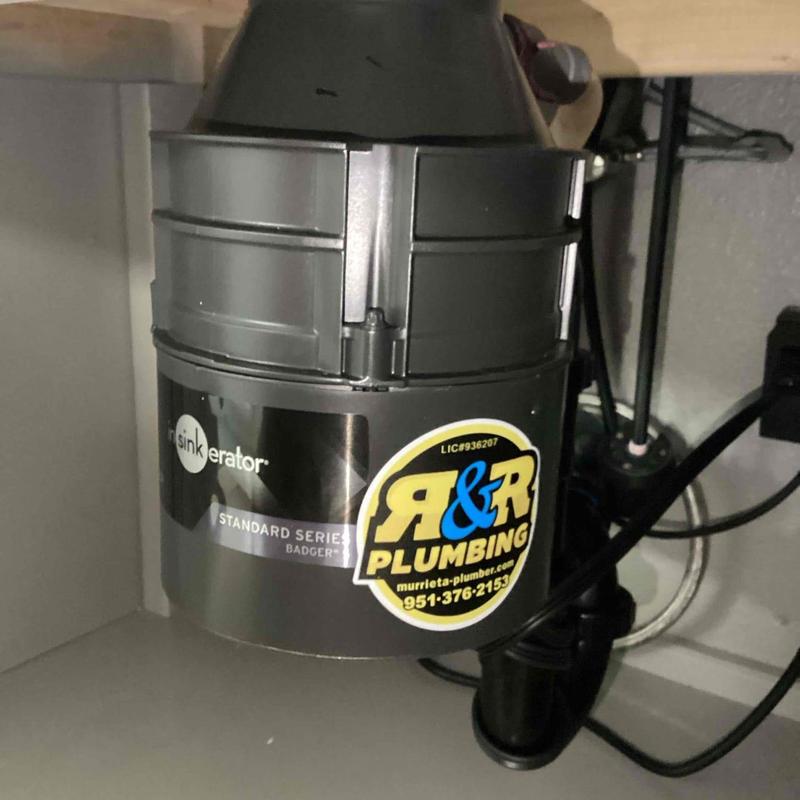 R and R Plumbing replaced a failed garbage disposal in Hemet, California. The plumber removed the damaged unit, installed a new sink flange and mounting bracket, and connected a Badger 5 garbage disposal. They also knocked out the dishwasher plug and reattached the drain lines to complete the installation.