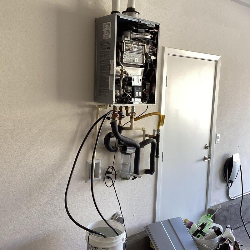A technician in Wildomar, California flushed a tankless water heater using a commercial descaling solution. The solution was circulated for 45 minutes to remove buildup. After the flush, the technician confirmed the unit operated correctly and showed no leaks. This service helps maintain heater function and prevent damage from mineral deposits.