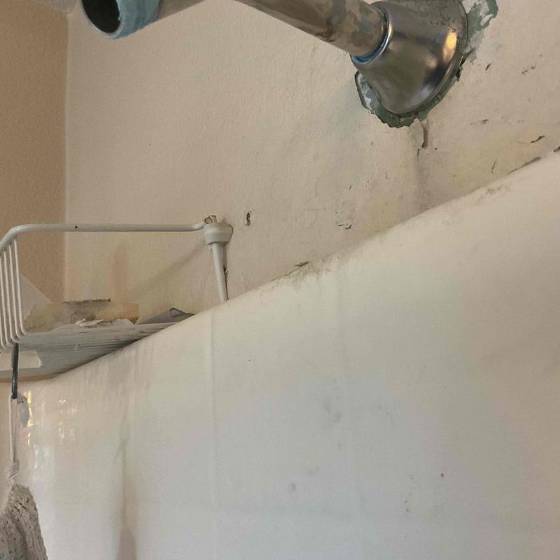 A plumber in Menifee, California cut drywall to locate a leak behind the wall. The service included replacing a copper master shower elbow fitting, a shower head arm, and a suction fitting. Drywall repair was not included in the project.