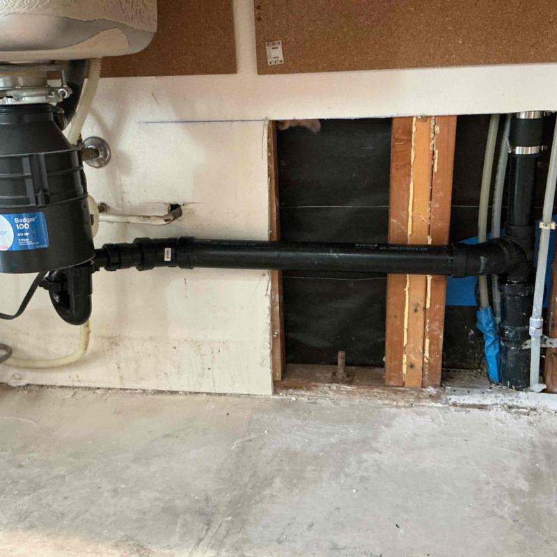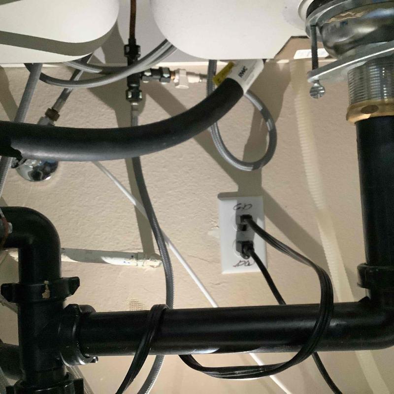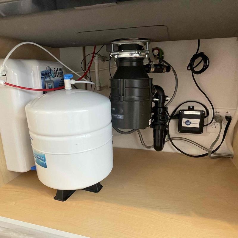 A plumber in Wildomar, California installed a customer-supplied garbage disposal and added new tubular drain piping under the kitchen sink. The plumber corrected the dishwasher drain line, reinstalled the reverse osmosis system, and added a black-finish air switch. The plumber tested for leaks by filling and draining the sink. No leaks were found.