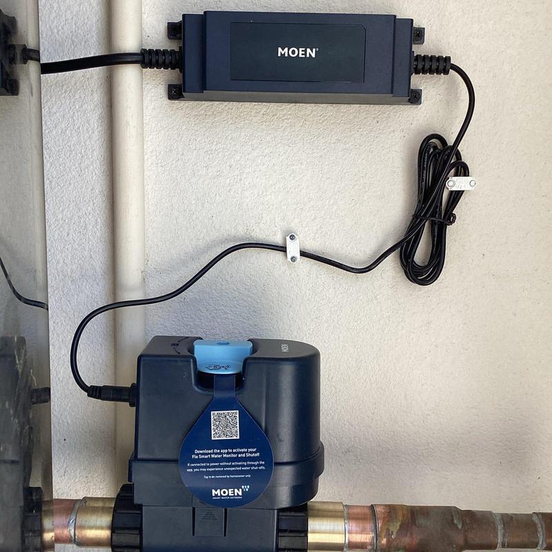 A plumber installed a Moen Flo smart water monitor in Hemet, California. After installation, they restored the water supply and confirmed no leaks. The customer was advised to download the mobile app before activating the device.