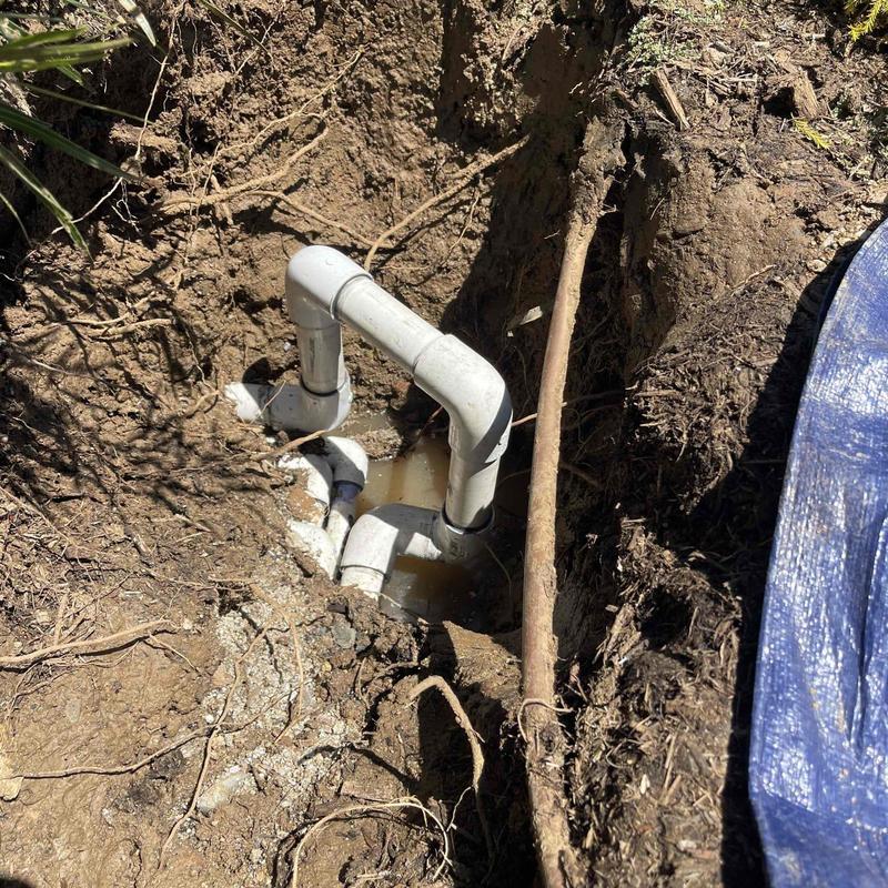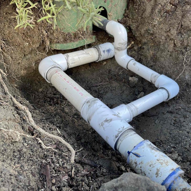 A plumber in Menifee, California repaired a broken PVC 90 fitting in a front yard. The service included cutting and replacing pipe sections, installing new couplings and elbows, and restoring water flow to both irrigation and main water lines. The plumber verified all connections were sealed with no leaks after curing.