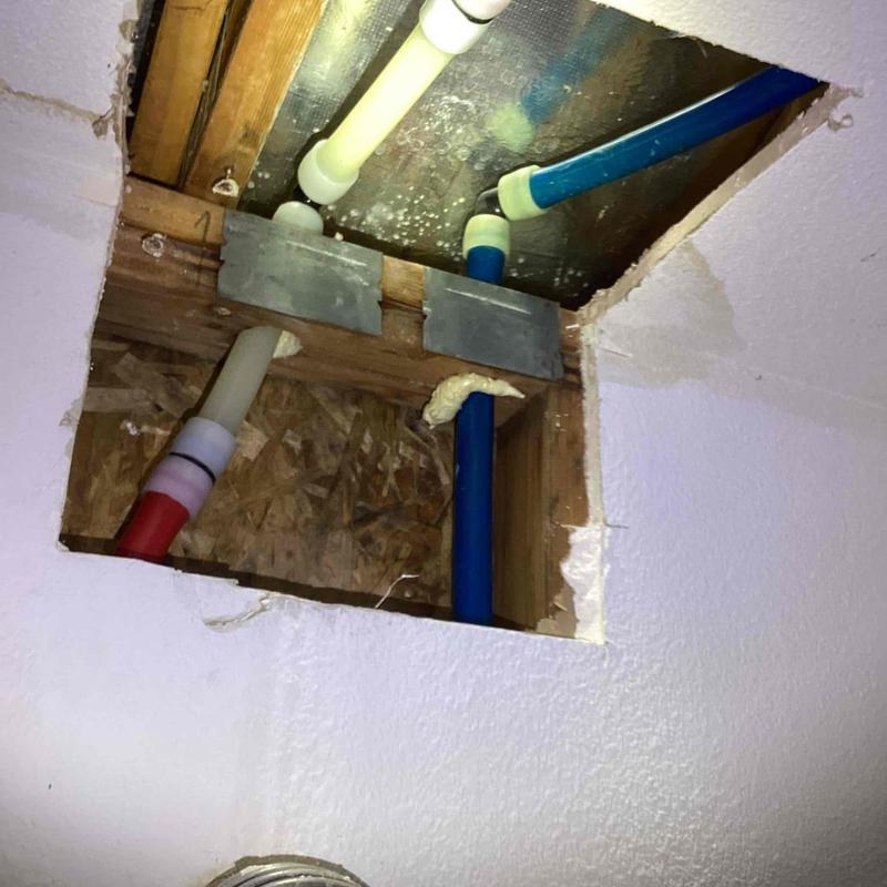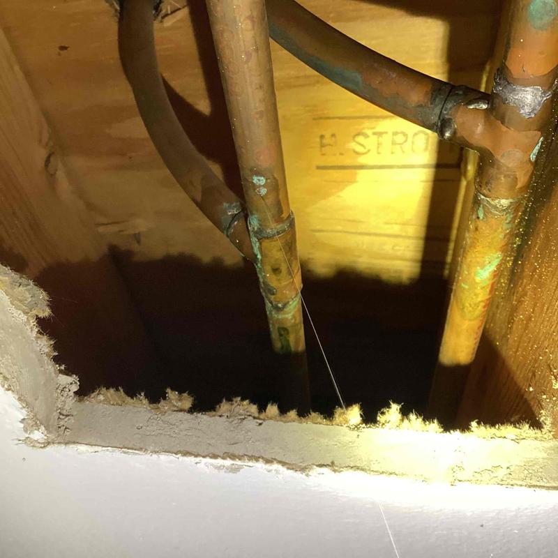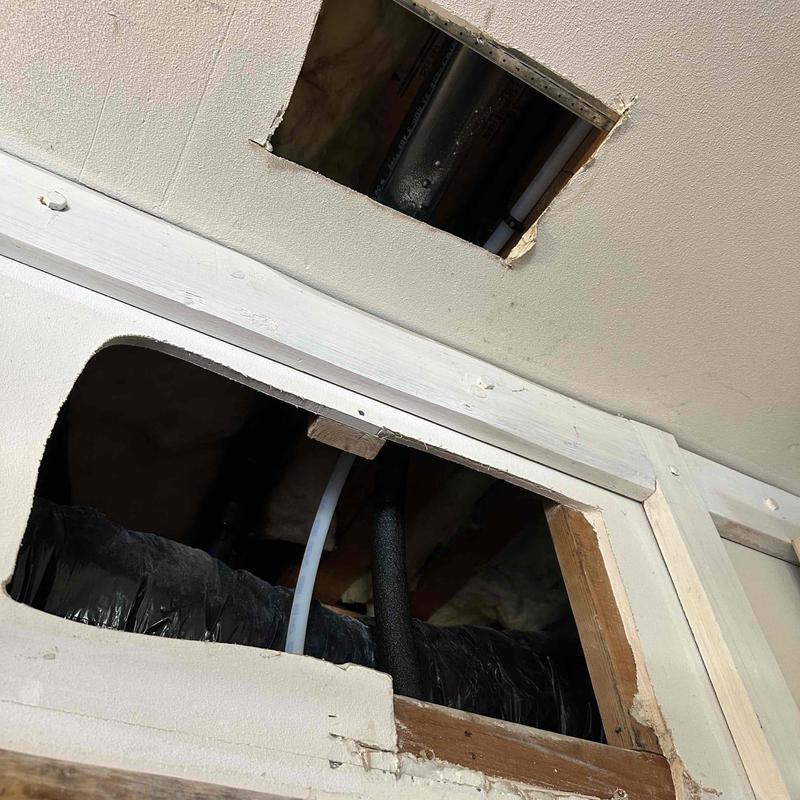 R and R Plumbing repaired a copper water line in Menifee, California. The team cut into the ceiling and subfloor to access the damaged pipe. They shut off and drained the system, replaced the section with copper piping and Pro Press fittings, restored water, and pressure-tested the system to confirm proper operation.