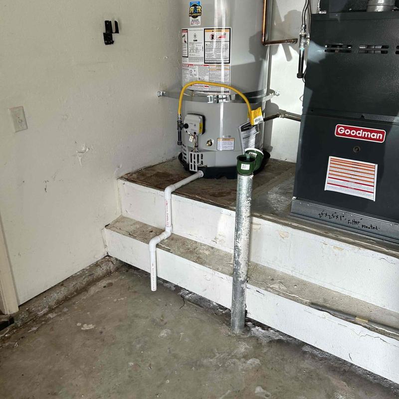 R and R Plumbing replaced a leaking water heater in Menifee, California. The plumber removed the old unit, installed a new one with updated gas and water lines, added a sediment trap, fitted a catch pan, and connected a new expansion tank to the cold inlet on the water heater.