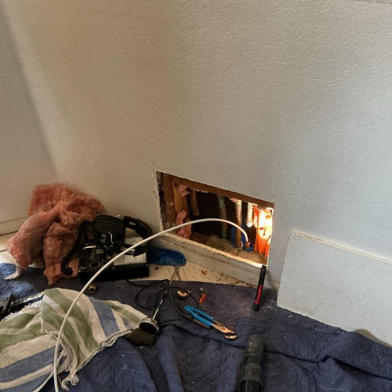 R and R Plumbing located a burst copper water line under a concrete slab in Perris, California. Technicians performed electronic leak detection, opened drywall for access, and rerouted the damaged pipe through walls and under equipment using Wirsbo PEX piping to restore household water supply. Drywall repair and painting were not included.