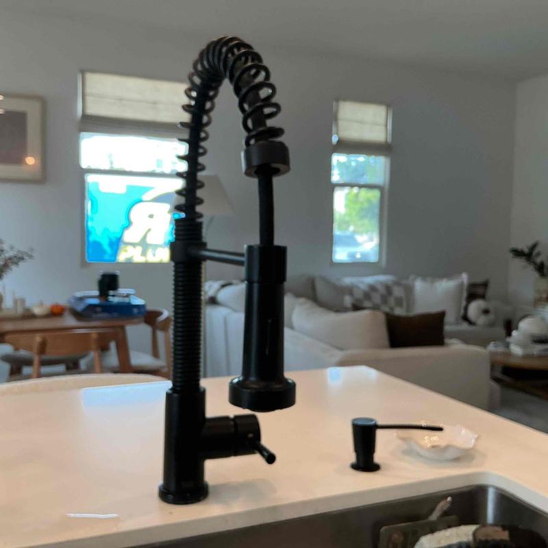 A plumber in Oceanside, California removed a leaking kitchen faucet and replaced it with a customer-provided unit. The plumber installed new water supply lines, connected them to the existing shut-off valves, secured the faucet to the countertop, and verified all connections. The system was tested for proper function and no leaks were found.