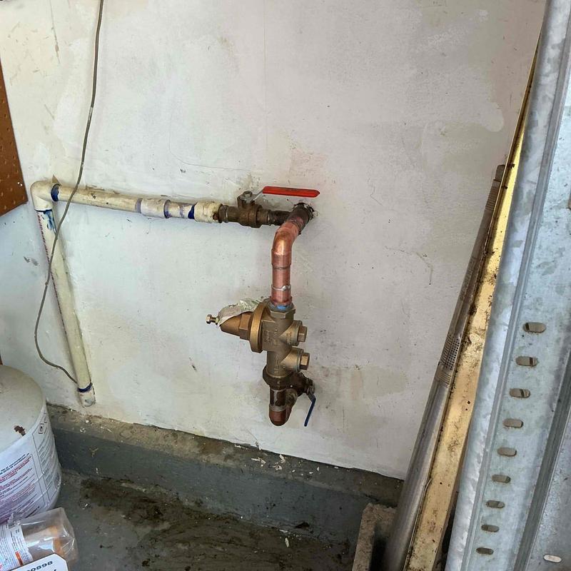 A plumber in Oceanside, California installed a new pressure regulator on a main water riser in a residential garage. The plumber removed a section of copper pipe, replaced it with new piping and fittings, and restored water flow. The system now runs at 48 psi, within the normal range, with no leaks found after installation.