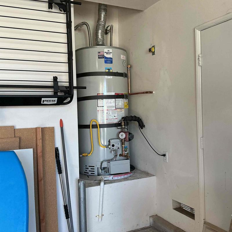 R and R Plumbing replaced a malfunctioning garage water heater in Fallbrook, California. The technician installed a new 75-gallon Bradford White unit with updated water lines, gas line, and drain pan. They reconnected the temperature and pressure relief valve, recirculating pump, and tested the system to confirm proper operation.
