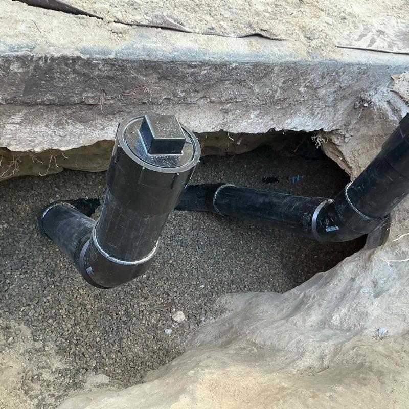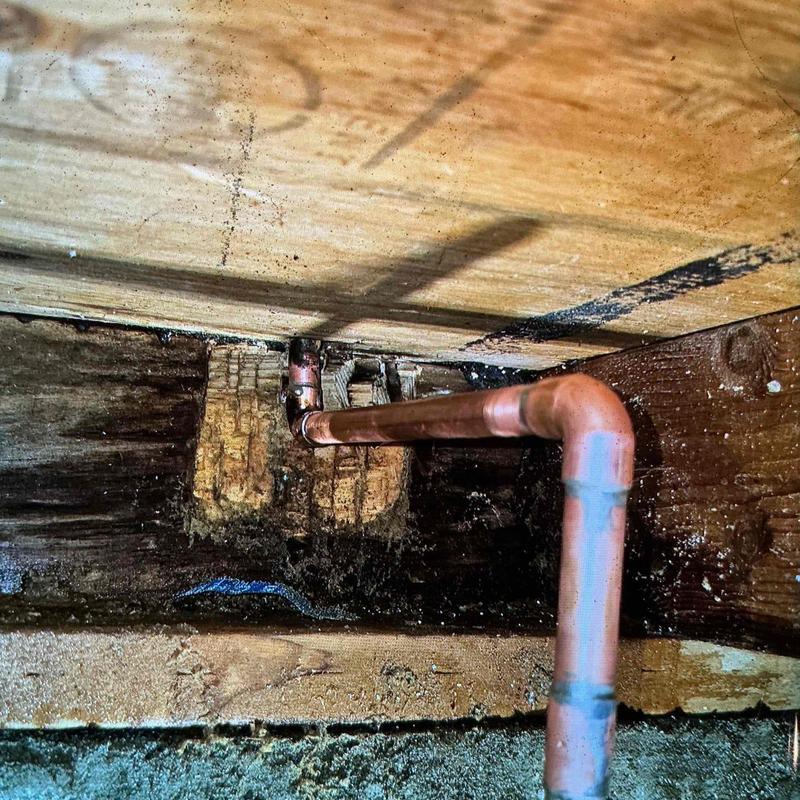 R and R Plumbing repaired a leaking water line in a crawl space in San Marcos, California. Technicians removed a damaged copper pipe section caused by a nail puncture. They installed a new pipe segment and pressurized the water system to confirm the leak was fixed.