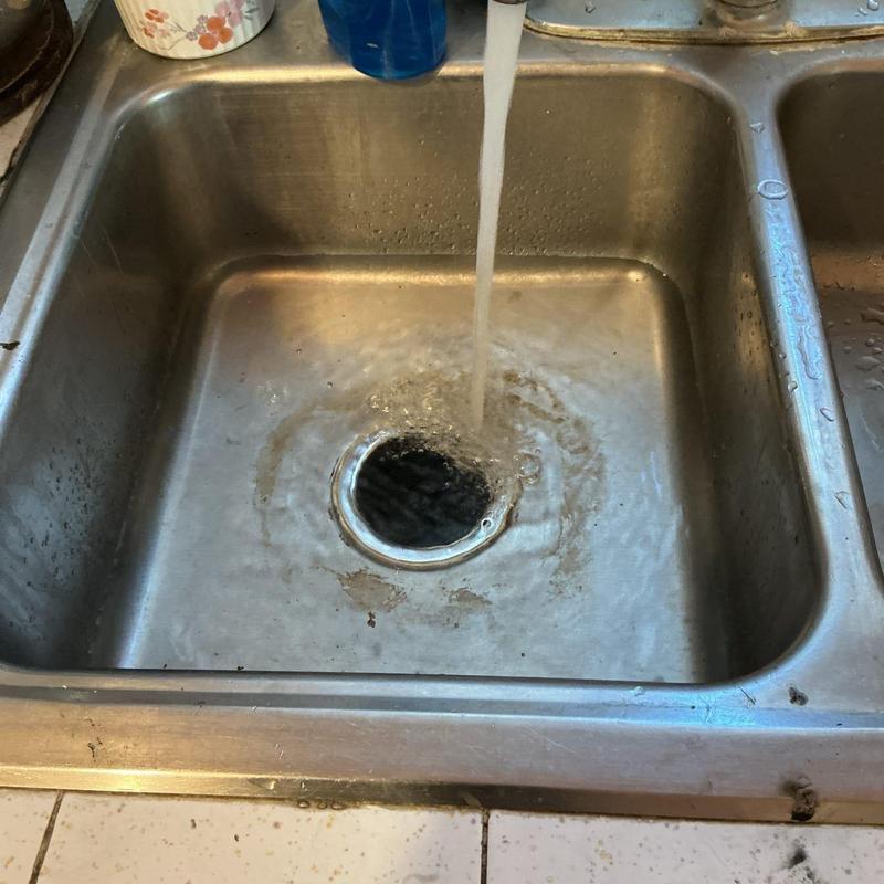 A plumber in Escondido, California, cleared a partial kitchen drain backup using a rigid flex shaft tool to restore full water flow. The plumber also replaced the left-side basket strainer on the kitchen sink and secured all fittings. Final tests showed no leaks or clogs under the sink.