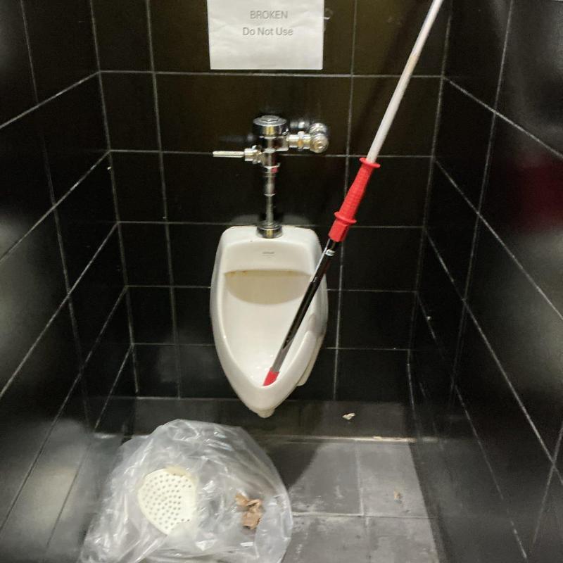 A plumber in Oceanside, California cleared a clogged urinal caused by heavy calcium buildup. The plumber applied a urinal treatment solution and used a urinal snake to remove deposits. Flow was successfully restored without removing the fixture. The urinal is now fully operational.