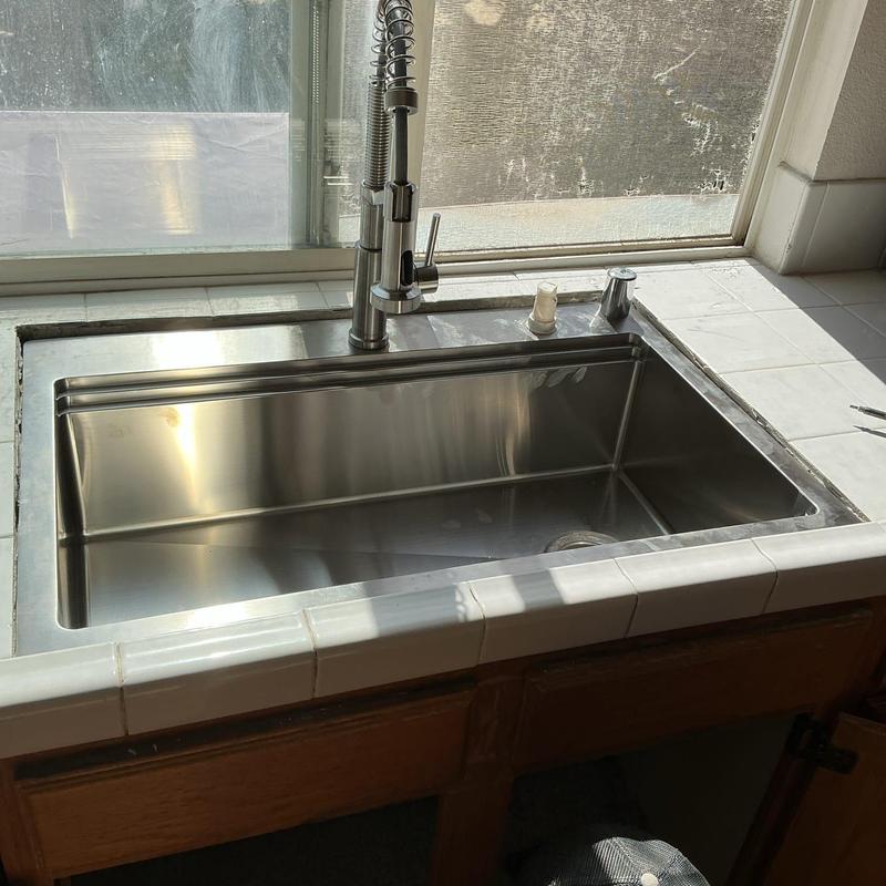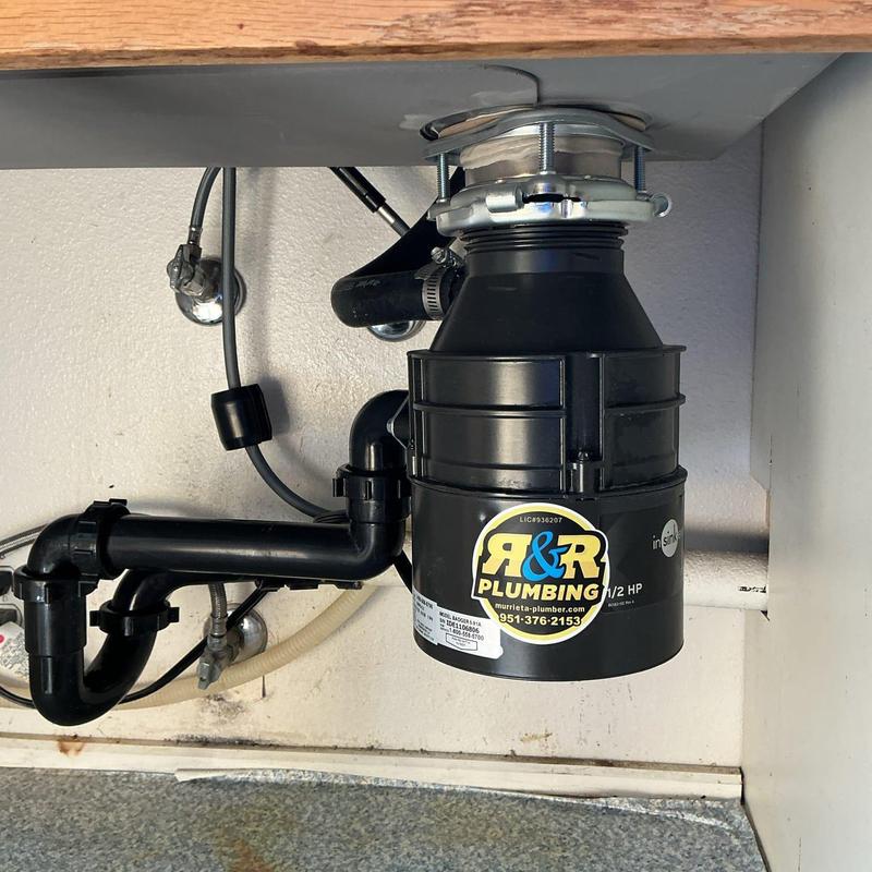 R and R Plumbing installed a new InSinkErator Badger continuous feed garbage disposal in Riverside, California. The project included gasket and tailpiece installation, upgraded drain piping with removable fittings, and faucet replacement. The setup supports an optional sinktop button and connects via plug or direct wire.