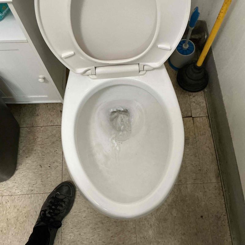 A plumber in Riverside, California removed an old toilet, inspected the drain with a camera, and installed a new customer-supplied toilet using a wax ring and closet bolts. The inspection found no drainage issues. The technician confirmed secure installation and reported past water damage but did not apply caulk due to existing conditions.