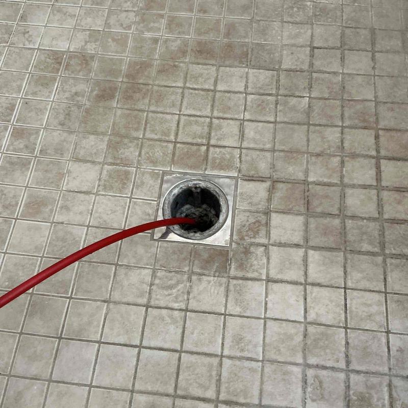 A technician in Riverside, California inspected and cleared a clogged master bathroom shower drain. They removed hair, soap scum, and grout using a drain snake. After clearing the blockage, they performed multiple flood tests to ensure proper drainage. The technician cleaned the area after confirming there was no standing water or backup.