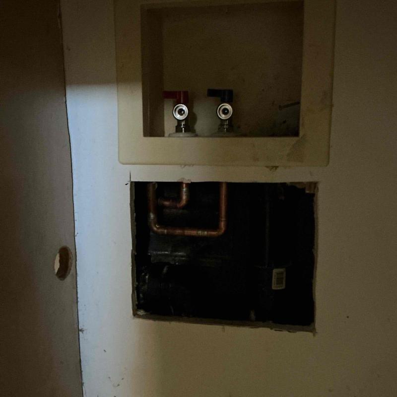 A plumber in Riverside, California repaired leaking laundry valves inside a wall. The plumber removed drywall under the valves, accessed the copper pipes, and installed new quarter-turn laundry valves for improved function and control.
