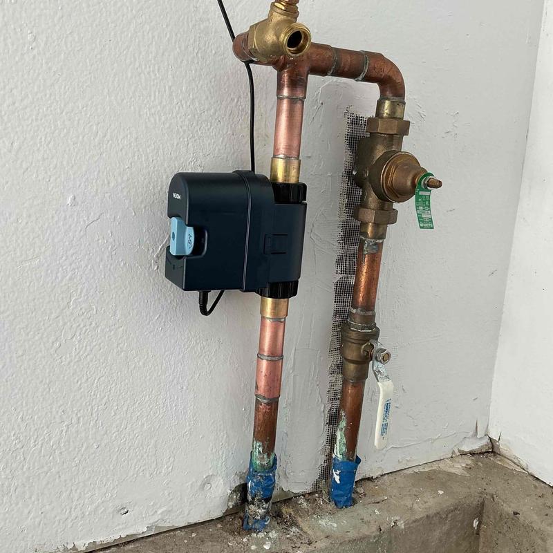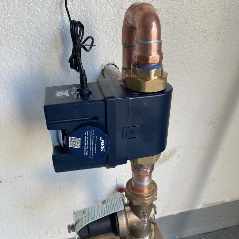 A plumber in Temecula, California, replaced a section of 1 1/4 inch copper pipe with a new Moen Flo smart water shutoff. The plumber also replaced a faulty pressure regulator with a 1 1/4 inch Zurn Wilkins model and reset water pressure to 70 psi to meet code requirements. Water service was restored without leaks.