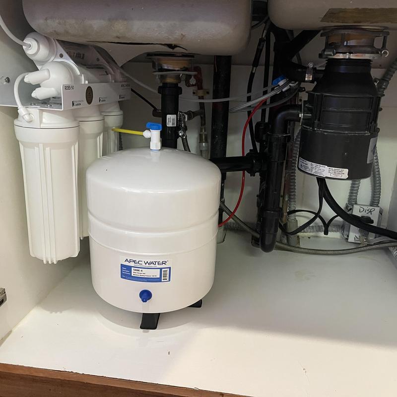 A plumber in Murrieta, California installed an APEC Water Systems 5-stage reverse osmosis filtration unit under a kitchen sink. The job included fitting the new RO spout, connecting the drain to existing plumbing, activating the system, and checking for leaks. The customer was informed to discard the first filtered tank of water.