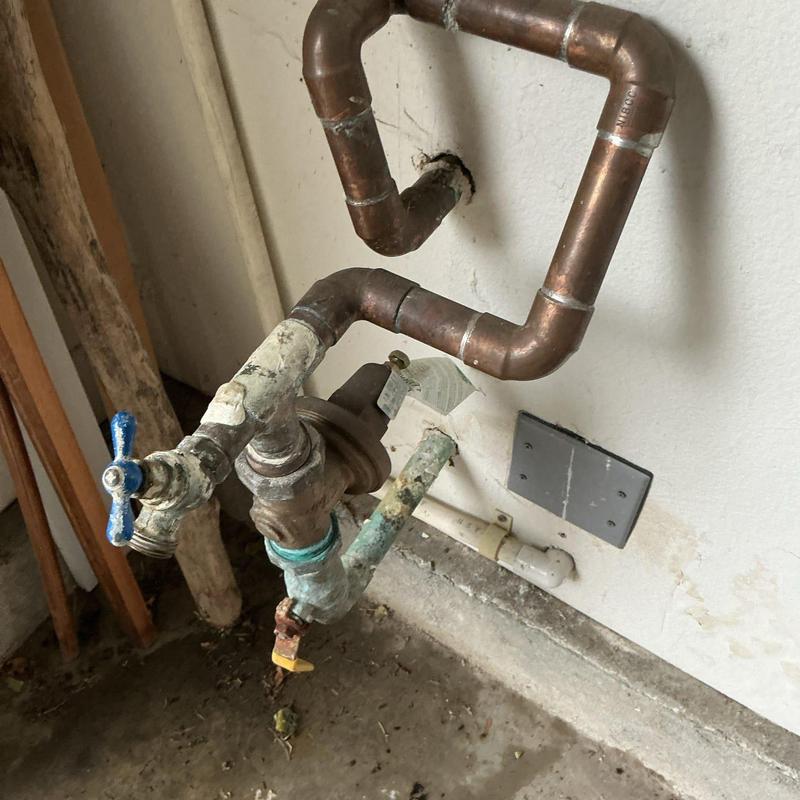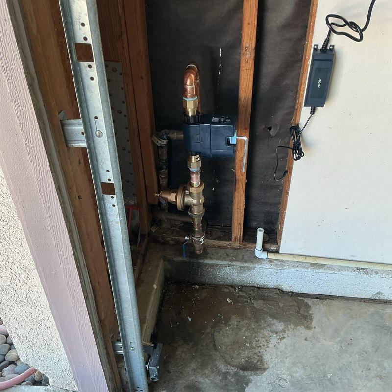 A plumber in Murrieta, California replaced the home’s main water line using type L copper. The work included installing a new regulator, ball valves inside the garage and outside for landscaping, and replacing exterior PVC with copper. A new ¾-inch hose bib was also installed during the visit.