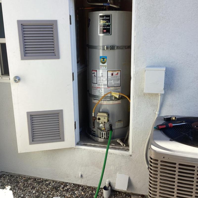 R and R Plumbing replaced a 40-gallon natural gas water heater in a garage in Temecula, California. The work included draining the old unit, installing a new shut-off valve, supply lines, gas flex, drip, drain pan, vent modification, T&P drain line modification, and disposal of the old heater.