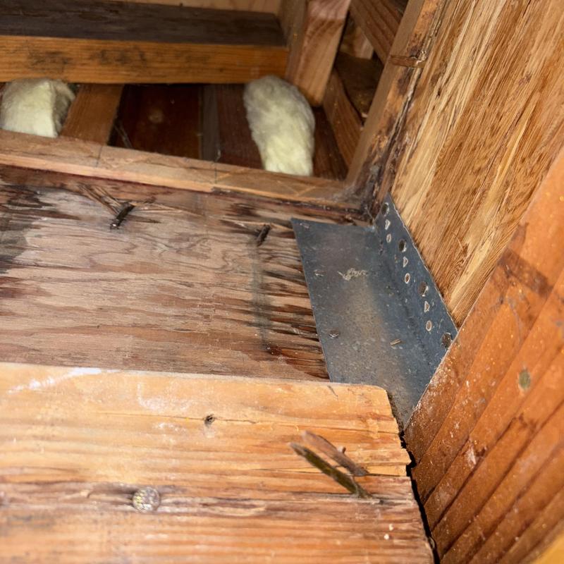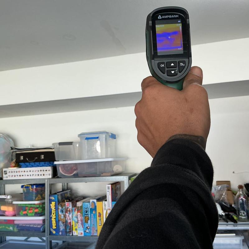 A plumber in Temecula, California opened drywall in a garage ceiling to inspect a water leak. Using electronic tools, the plumber traced the issue to a broken shower arm that was leaking at the threaded connection. The inspection confirmed the source of the water intrusion.