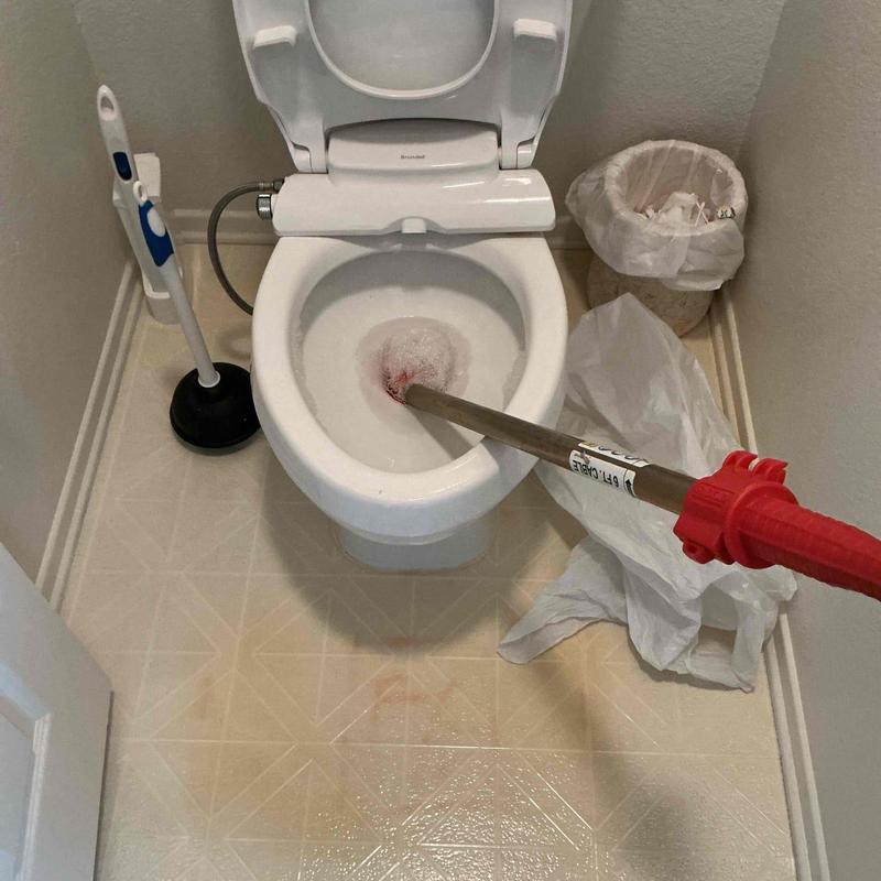 A plumber cleared a clogged master bathroom toilet in Temecula, California. The blockage was caused by flushable wipes. The plumber used a toilet auger to reach six feet into the drain line and restore proper flow. The customer was advised to dispose of wipes in the trash to avoid future clogs.